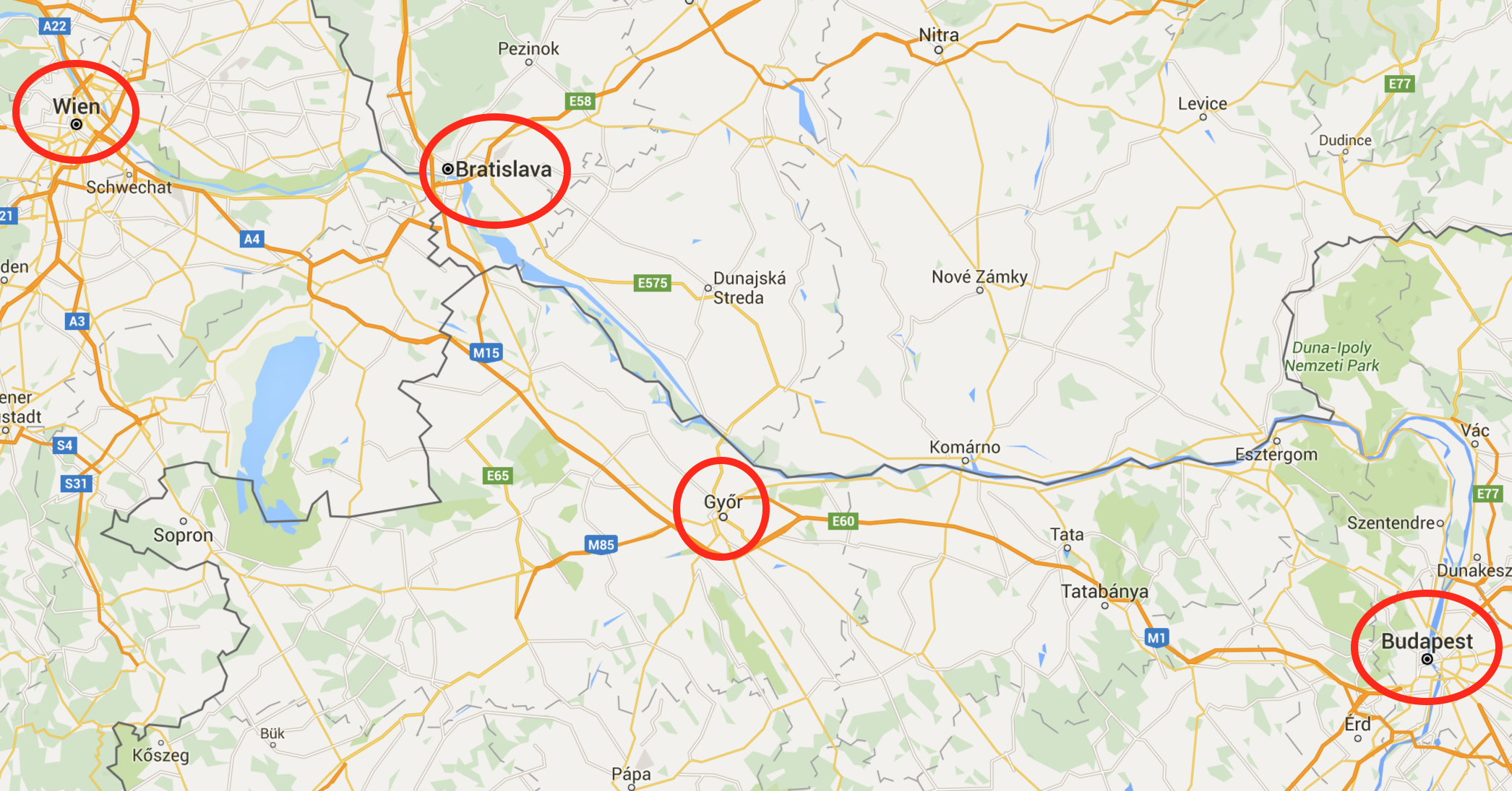 The central position of the business park at the important center between Vienna, Budapest and Bratislava qualifies the place for an unbeatable point of industry and trade. About 10 million people live in the area of 150 kilometres. The business park is in the south of Györ right next to the motorway M1 (E 60) Vienna – Budapest (exit Györ south / Veszprém / Balaton) and the Federal Highway no.82, which is the most important connection to Veszprém and Lake Balaton. The Business Park is in sight of about 10.000.000 vehicles passing on the M1 / 82 a year. In addition to that the new motorway E65 from Prag to Bratislava has been connected to the M1 not far from Györ shortly. This way Györ has an excellent traffic connection for transit and tourist traffic. The distance to the city center of Györ is about 5 minutes by car. International airports are at the following distances: